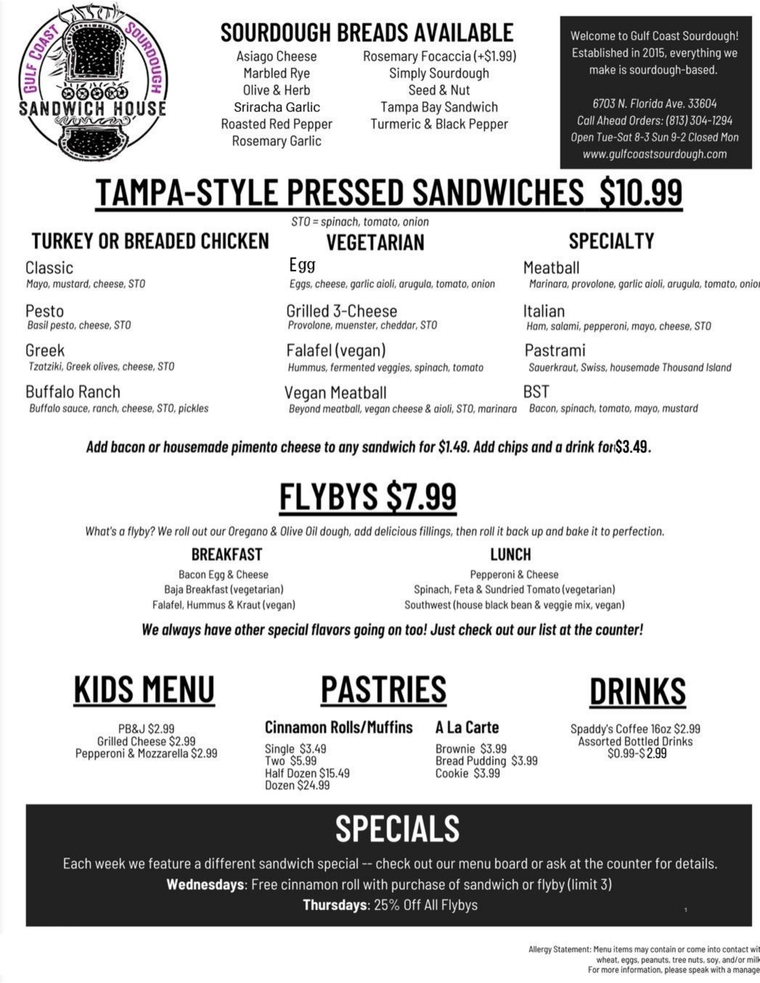 We serve Tampa-style pressed breakfast and lunch sandwiches, cinnamon rolls, flybys, and bread, of course :)